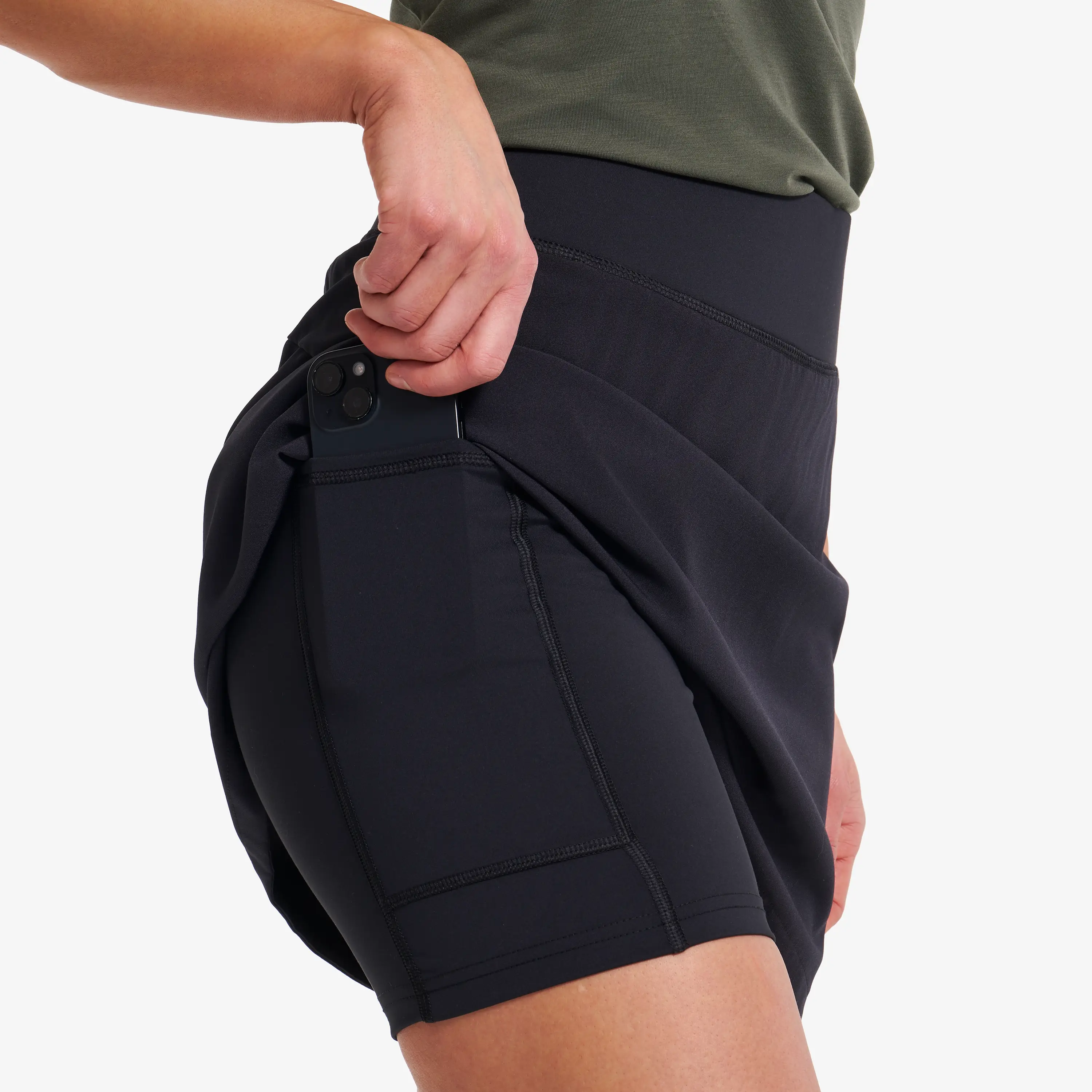 The Rise 2-in-1 Skirt is a lightweight, moisture- wicking outdoor skirt made for more intense outdoor activities. This highly comfortable skirt features an elastic waistband, elastic inner tights that prevent chafing and are equipped with a thigh pocket for your mobile. It also has a convenient waist pocket. The Rise 2-in-1 Skirt is the ideal choice for intense outdoor activities in warmer conditions, offering the perfect combination of comfortable, well-fitting outdoor shorts with the look of a skirt.